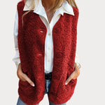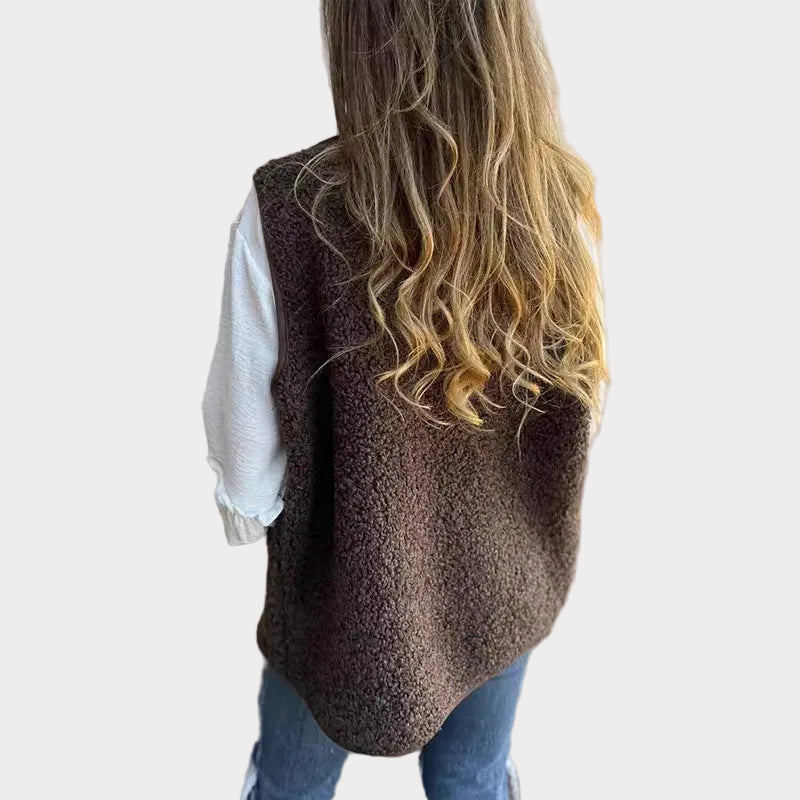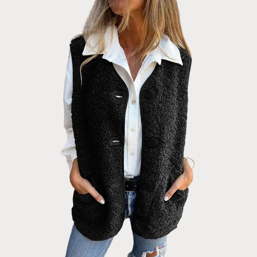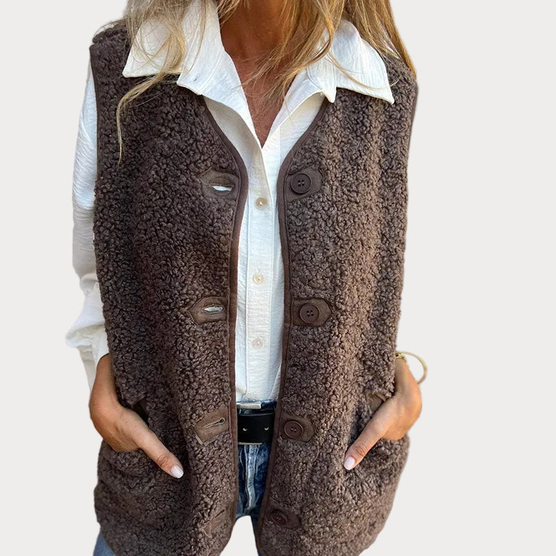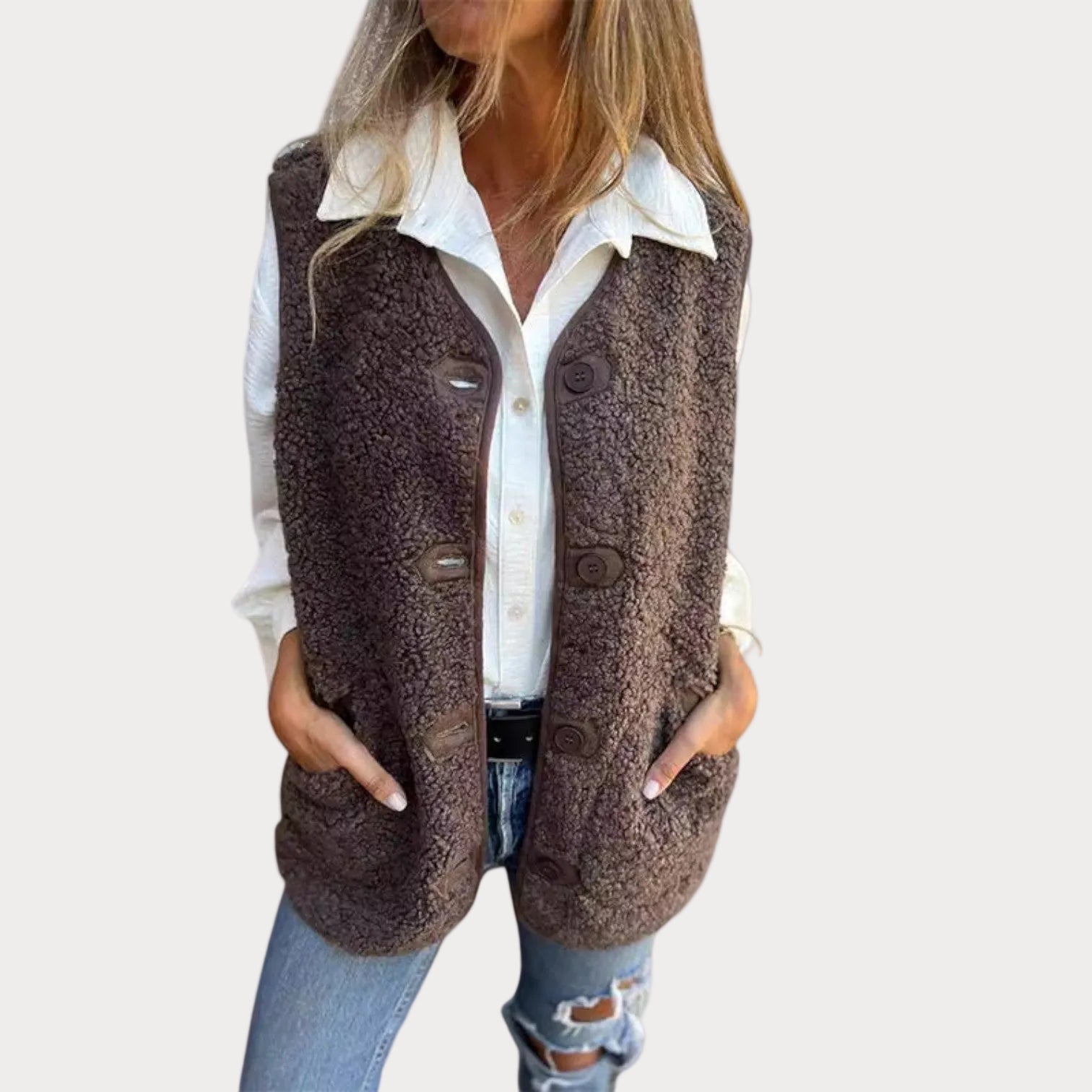 Ostanite udobni i chic s Magdalena prslukom s gumbima — mekim, bez rukava, osnovnim komadom koji spaja udobnost s bezvremenskom elegancijom. Savršen za slojevite kombinacije, pruža toplinu bez težine, čineći ga neizostavnim komadom za jednostavne svakodnevne outfite.