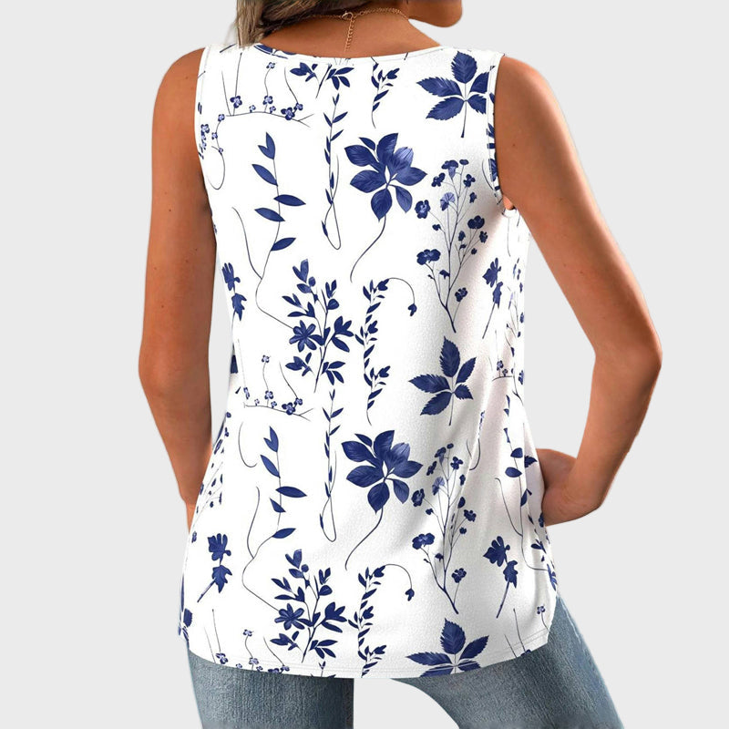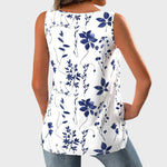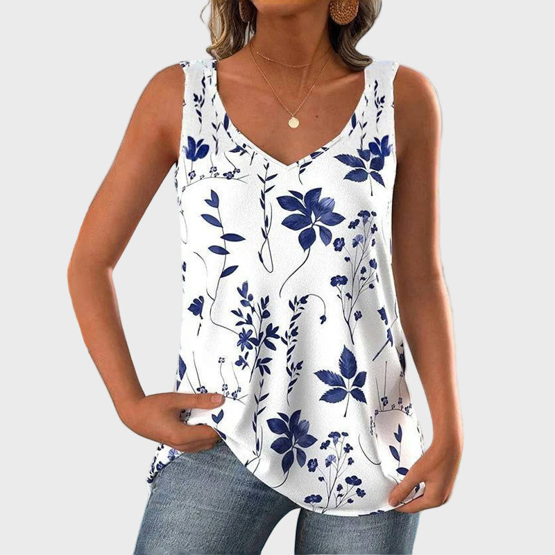 Uživajte u svježini ljeta s ovom majicom bez rukava na bijeloj podlozi, ukrašenom plavim cvjetnim uzorcima. Njegova ležerna silueta pruža udobnost i slobodu pokreta, dok V-izrez dodaje ženstvenost i eleganciju. Idealna je za svakodnevne i ljetne kombinacije.
