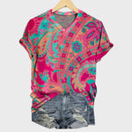 Istaknite se s ovom živahnom majicom u intenzivnim nijansama fuksije i tirkizne, s impresivnim šarenim uzorcima. Njen ležeran dizajn s kratkim rukavima i udobnim krojem čini je idealnom za ljetne izlete, svakodnevne šetnje i ležerne kombinacije pune energije i stila.