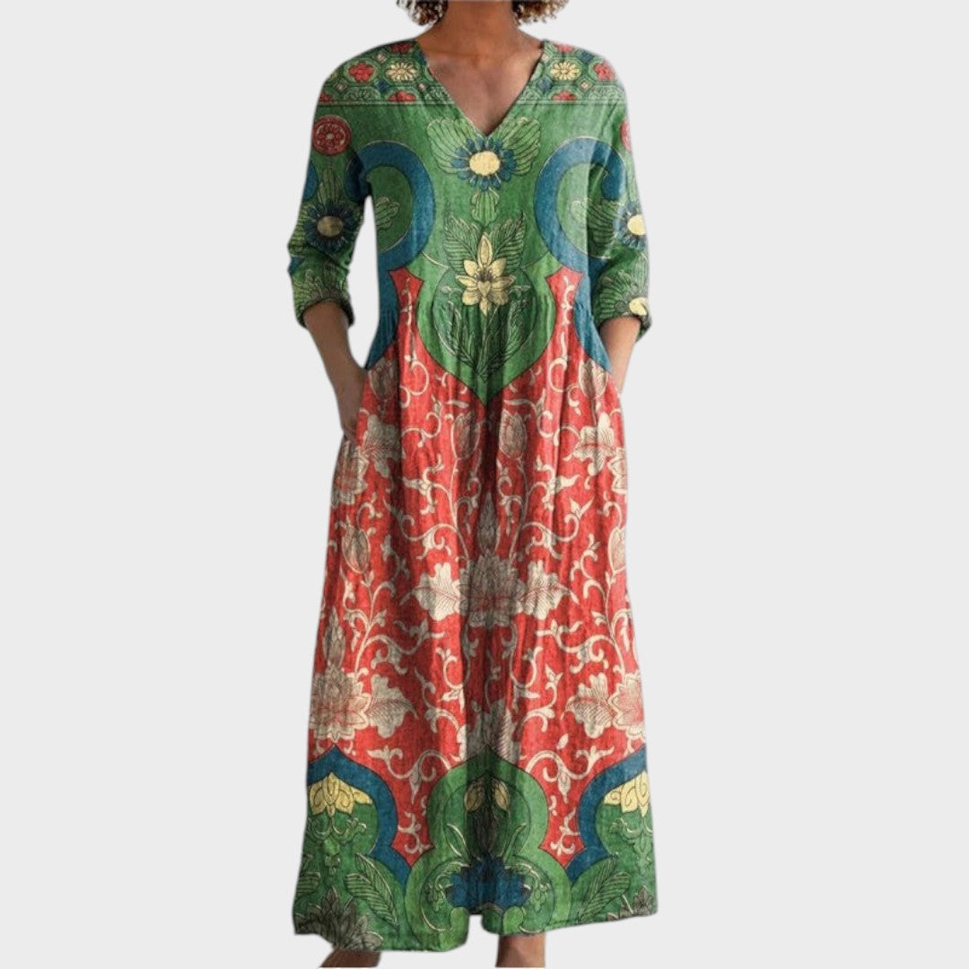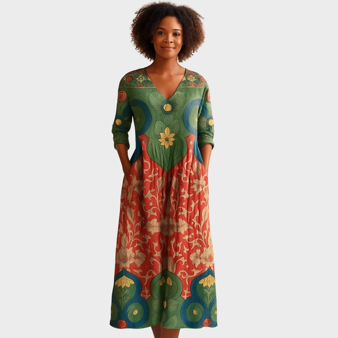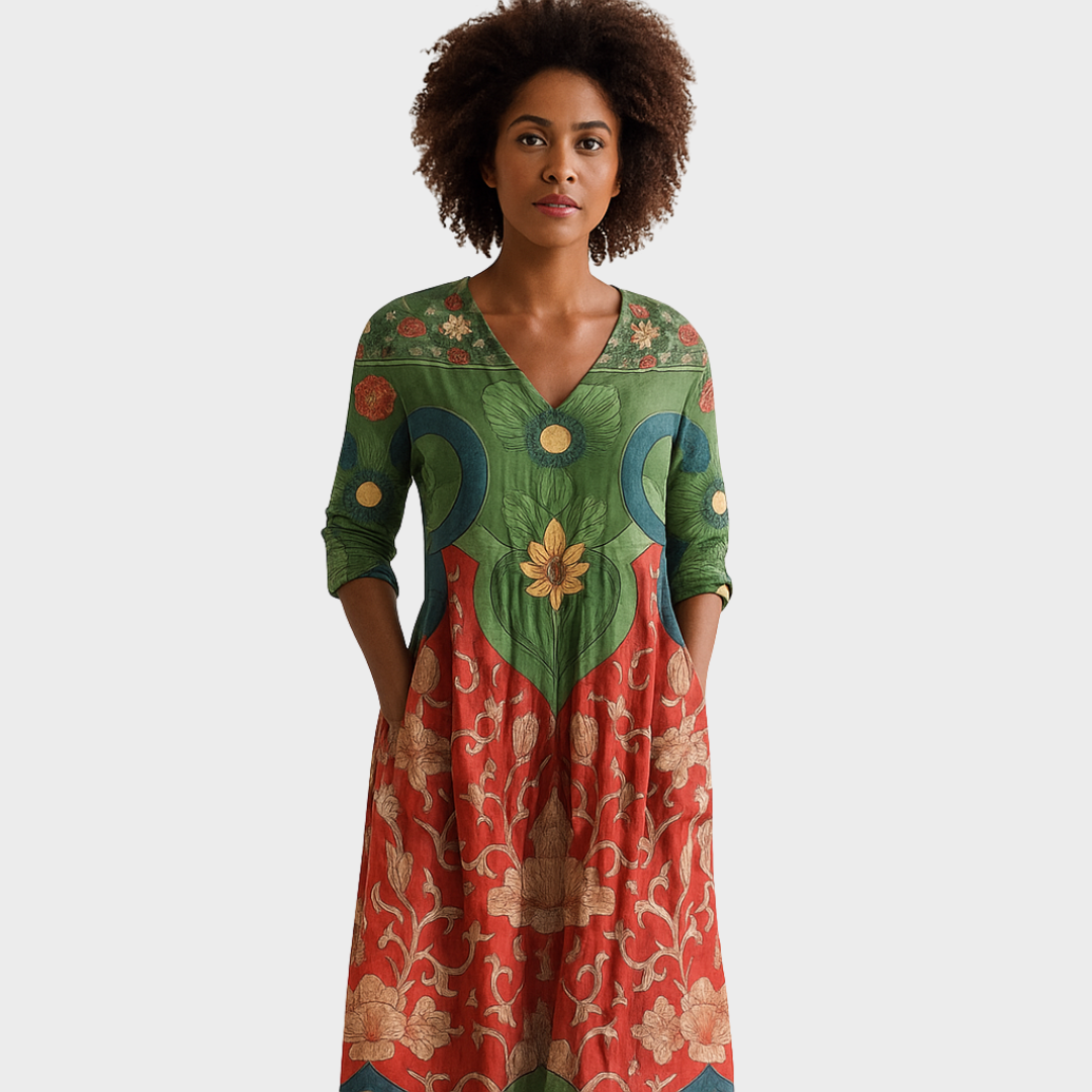 Ova haljina spaja umjetnički dizajn i udobnost u savršenoj ravnoteži. S bogatim etno uzorkom, V-izrezom i praktičnim džepovima, idealna je za žene koje vole originalnost i slobodu u odijevanju. Lepršavi kroj omogućuje lakoću kretanja, a upečatljivi detalji daju poseban šarm svakoj prilici.