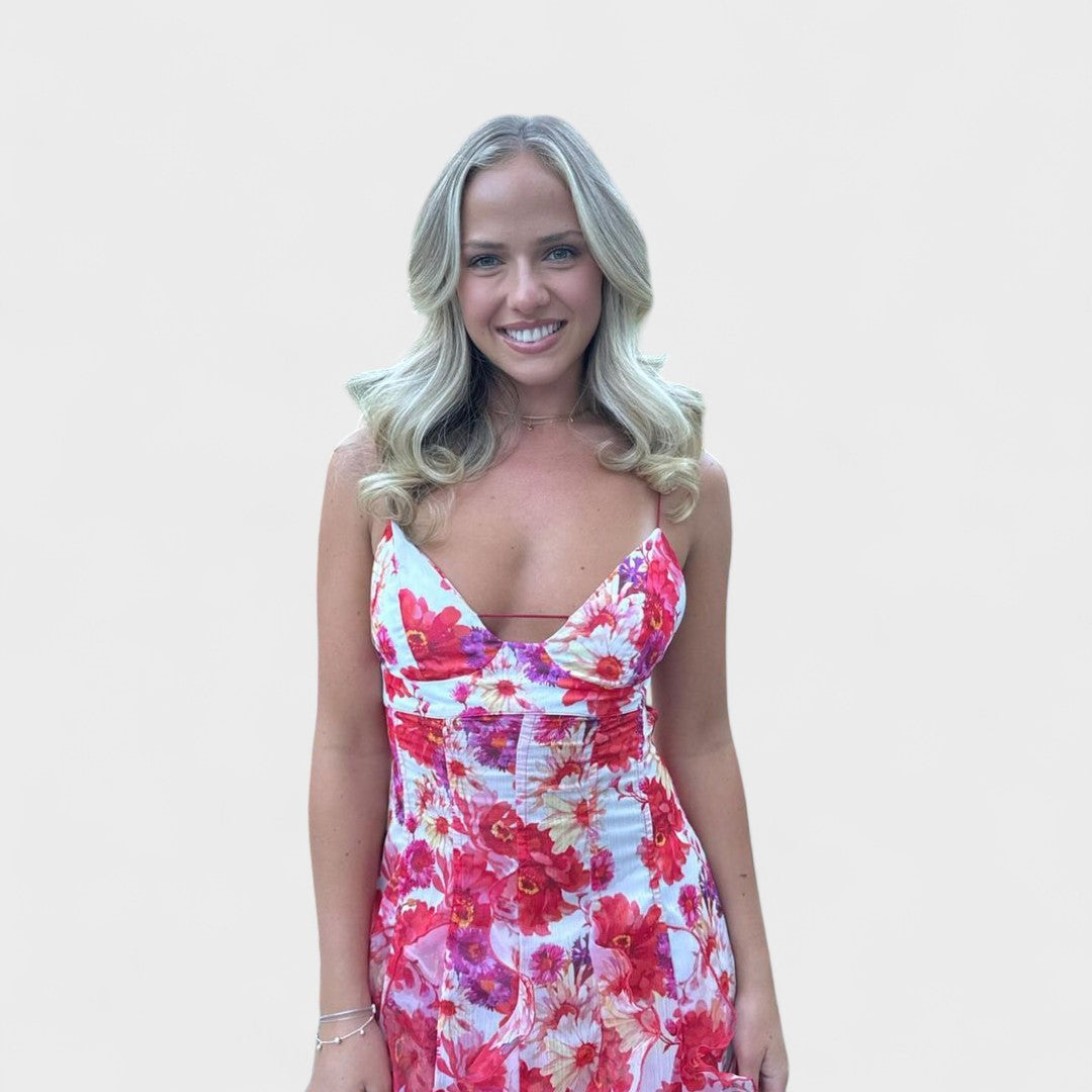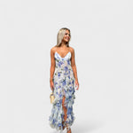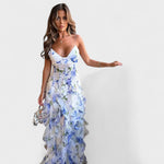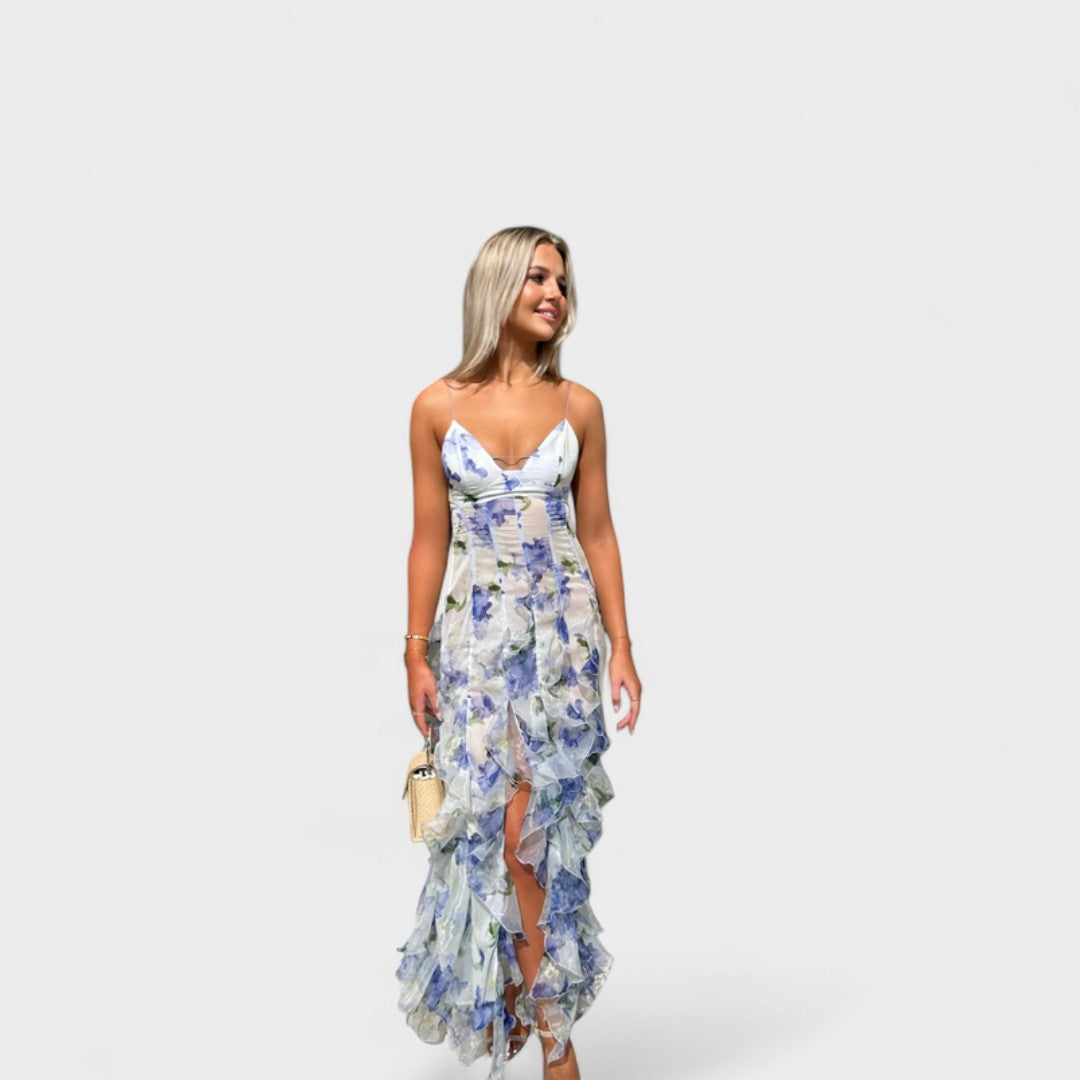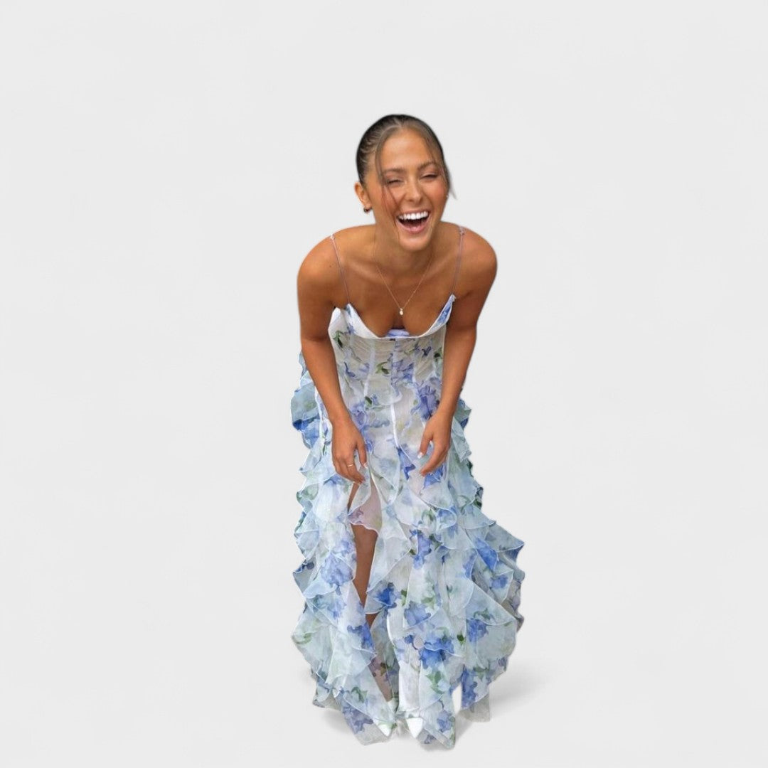 Ova duga cvjetna haljina s volanima unosi dašak sofisticiranosti i elegancije u svaku priliku. Zahvaljujući ženstvenom kroju i raskošnim detaljima, pruža besprijekoran balans između udobnosti i glamura. Idealna je za svečane prigode, proslave ili posebne trenutke kada želite zablistati.