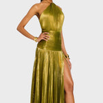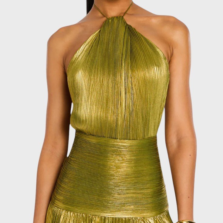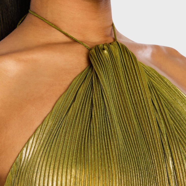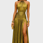 Haljina Vilma očarava svojim metalik peridot nijansom, lepršavim siluetom i rafiniranim detaljima. S halter izrezom, otvorenim leđima i visokim prorezom, spaja hrabrost i eleganciju – idealna za gala večeri, večere i nezaboravne noći, ispunjene mistikom i ženstvenošću.