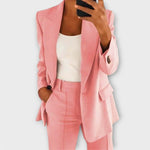 Christina™ ženski odjevni komplet izrađen je od visokokvalitetnih materijala i pruža savršen spoj udobnosti i sofisticiranog stila. Klasičan kroj sa sakoom i hlačama osigurava elegantan izgled koji se lako prilagođava poslovnim, svečanim i svakodnevnim prigodama.