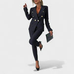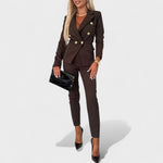 Sofisticirani komplet stvoren za žene koje žele izgledati profesionalno i samouvjereno. Dvoredni sako s dekorativnim gumbima oblikuje struk i daje savršenu strukturu, dok uske hlače cigareta kroja, dužine do gležnja, vizualno izdužuju siluetu. Udobna tkanina s blagim rastezanjem prati pokret i zadržava besprijekoran izgled od jutra do večeri. Džepovi s preklopom i čisti kroj čine ga idealnim za ured, sastanke i svečane prilike — nosite ga kao komplet ili odvojeno.