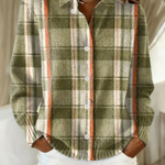 Košulja Klara kombinira maslinasto-zelene nijanse s finim bež, bijelim i narančastim akcentima u skladnom kariranom uzorku koji odiše toplinom i prirodnim šarmom. Zeleni tonovi pružaju smirujući, zemljani izgled, dok suptilni okomiti naglasci unose dinamiku i svježinu. Meka tekstura čini je iznimno udobnom, a klasičan kroj s gumbima osigurava bezvremenski stil.