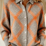 Košulja Lea spaja tople sive tonove s upečatljivim narančastim linijama koje tvore veliki, moderan karirani uzorak. Ovaj kontrast daje košulji živopisan, ali istovremeno elegantno smiren izgled. Pletena tekstura pruža osjećaj topline i ugode, dok klasičan kroj s gumbima čini ovaj model svestranim i lako uklopivim u različite stilove.