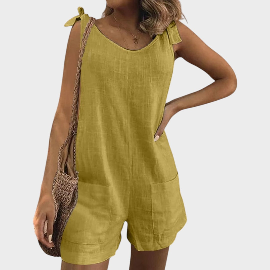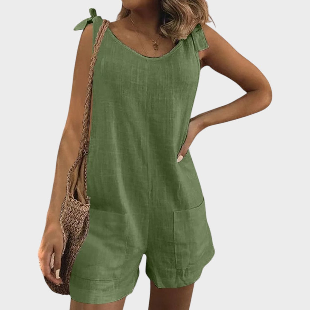 Ovaj lagani kombinezon savršen je izbor za tople dane i opuštene prilike. S modernim krojem bez rukava, praktičnim džepovima i ženstvenim vezanjem na ramenima, donosi spoj udobnosti i stila koji će vas pratiti od jutra do večeri.