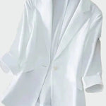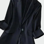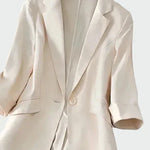 Elegantni sako s bezvremenskim krojem i modernim dizajnom. Ima rever, prednje zatvaranje s jednim dugmetom i duge rukave s dekorativnim dugmetima na rubu. Njegov ravni kroj čini ga idealnim za poslovne prilike, ali i za opuštenije trenutke. Komad koji dodaje stil i sofisticiranost svakom outfitu.