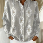 Košulja Sara spaja meke sive tonove s profinjenim bijelim ornamentalnim motivima koji stvaraju nježan, ženstven i smiren vizualni dojam. Suptilni uzorci u romb formi daju košulji poseban karakter, dok lagano vunasta tekstura pruža toplinu i udobnost. Klasični kroj s gumbima čini je izuzetno svestranom i lako uklopivom u različite stilove.